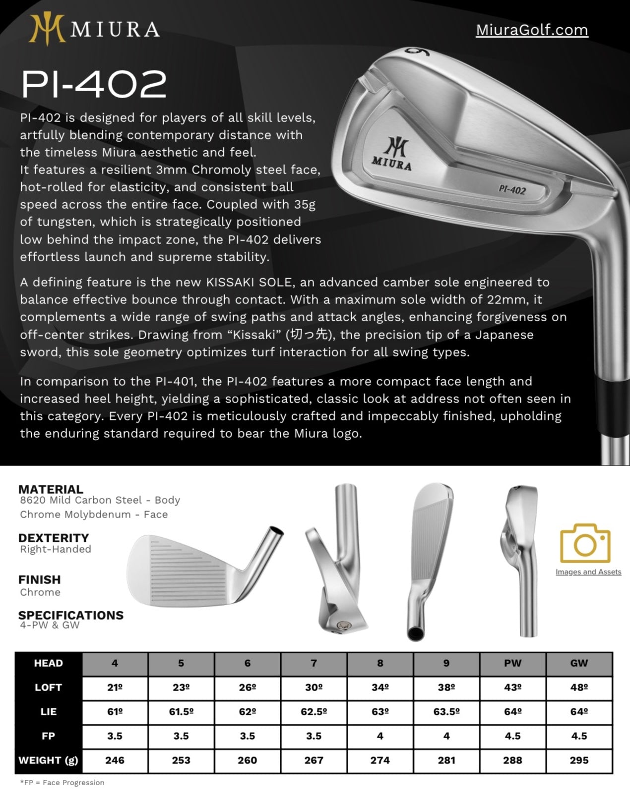 PI-402 is designed for players of all skill levels, artfully blending contemporary distance with the timeless Miura aesthetic and feel. It features a resilient 3mm Chromoly steel face, hot-rolled for elasticity, and consistent ball speed across the entire face. Coupled with 35g of tungsten, which is strategically positioned low behind the impact zone, the PI-402 delivers effortless launch and supreme stability.